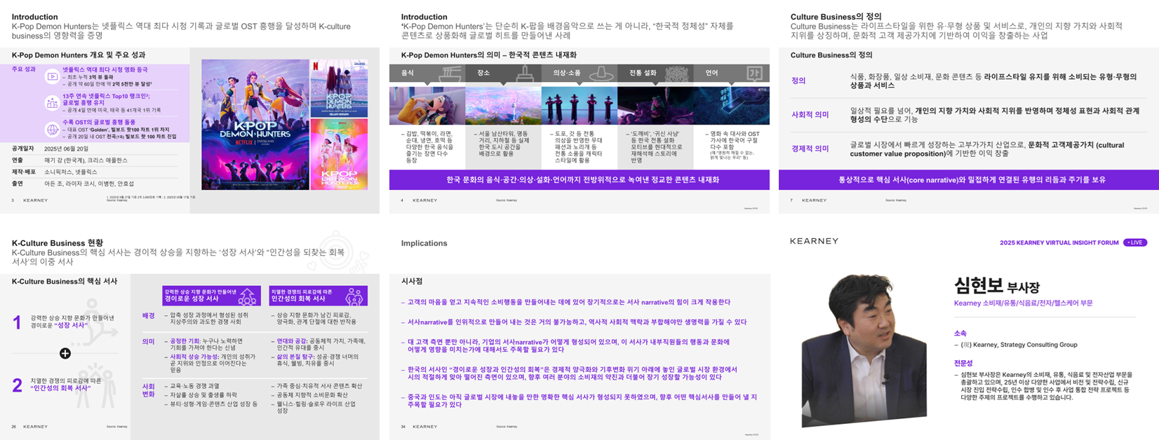 Kearney의 이번 Virtual Insight Forum에서 K-Culutre의 핵심 서사의 분석을 기반으로 향후 K-소비재가 어떤 방향으로 발전할 지에 대한 전망을 하고, 미래 새로운 사업의 기회를 모색하는 자리를 가져보았다.