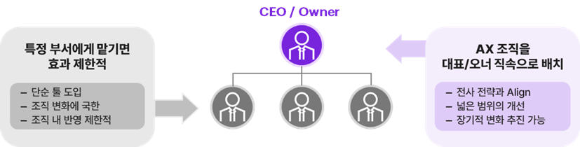 많은 기업들은 AX를 기업의 중장기적 성장을 견인할 수 있는 전략적 아젠다라고 인지하고 있다. 이러한 관점에서, 최근에는 AX 조직을 오너 또는 대표 직속으로 배치하고 있는 추세다.