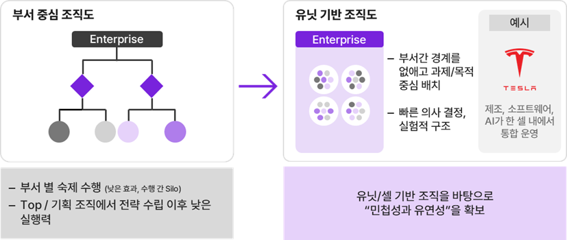 이에 따라 목적 기반의 Cell(Unit) 또는 스쿼드 형태로, 기능과 부서를 넘나드는 협업 구조를 운영하는 것이 효과적이다. 테슬라는 제조, 소프트웨어, AI 조직이 분리되어 있지만, 과제 단위에서는 스쿼드 형태로 결합해 동일한 목표를 향해 움직인다. 반면, 일부 기업에서는 전략 조직과 현업 조직 간 역할 분리로 인해 “왜 우리가 해야 하는가“라는 저항이 반복적으로 발생한다. 이 간극은 결국 오너 또는 대표 차원의 개입 없이는 해소되기 어렵다.