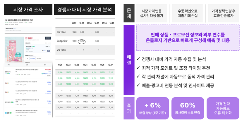 온톨로지 기반의 Price Agent는 시장 경쟁 가격 변동을 실시간으로 모니터링하고 이에 즉각 대응하는 Dynamic pricing AI 시스템이다. 사전에 학습된 모델이 데이터 간 상관관계를 자동으로 파악하고, 이를 연결 및 해석하여 가격 전략에 반영할 수 있도록 지원하는 것이다. 이를 통해 유통, 호텔, 여행 산업 등 경쟁이 치열한 영역에서 경쟁사의 가격 변화를 보다 신속하게 인지하고, 재고를 최소화하면서 판매 기회를 극대화하는 전략적 대응이 가능해진다. 기존 대비 의사결정 속도를 단축할 수 있다.