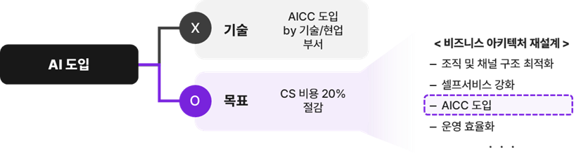 과거 AICC(인공지능 컨택센터) 도입 사례를 보면, 뚜렷한 비즈니스 목적 없이 ‘도입’ 자체를 목표로 시작한 사례가 많았다. 안타깝게도 성공 사례는 거의 없었다. 기술 성숙도, 비용 등 여러 한계가 존재했기 때문이다. 반면, ‘동종 업계 대비 CS 비용이 과도하게 지출되고 있다’라는 문제를 명확히 정의하고, 이를 개선하기 위한 다양한 수단 중 하나로서 AICC를 선택한 경우에는 성과를 측정하고 추적할 수 있는 구조를 설계할 수 있다. 즉, AI는 비즈니스 이슈에 대한 해결 수단으로 접근되어야 하며, 도입 자체를 목적으로 설정할 경우 효과를 입증하기도 어렵고 실패 확률이 높아진다.