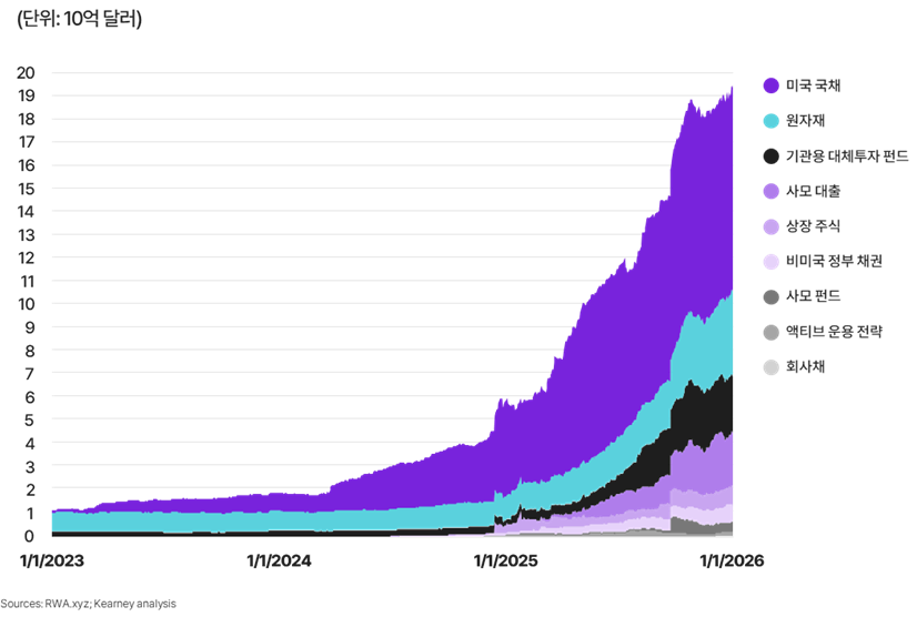 토큰화 기술이 안정화되면서, 투자 및 유통 도구로서 매력적인 수단으로 인정받고 있으며, 도입 속도 또한 급격하게 빨라지고 있다. 구체적으로 살펴보면, 그 자체로 거대하고 확고한 영역을 구축하고 있는 스테이블 코인을 제외하더라도 온체인(on-chain) RWA 시장은 2023년 초 11억 달러에서 2026년 1월 약 200억 달러로 성장했다. 이는 연평균 성장률(CAGR) 160%를 상회하는 급격한 속도다. 투자자 참여 또한 급증했는데, 2026년 1월 기준 토큰 자산 보유자는 50만 명을 넘어섰다. 온체인 데이터는 현재 어떤 자산군이 이러한 성장과 도입을 주도하고 있는지 명확히 보여준다(그림 1).