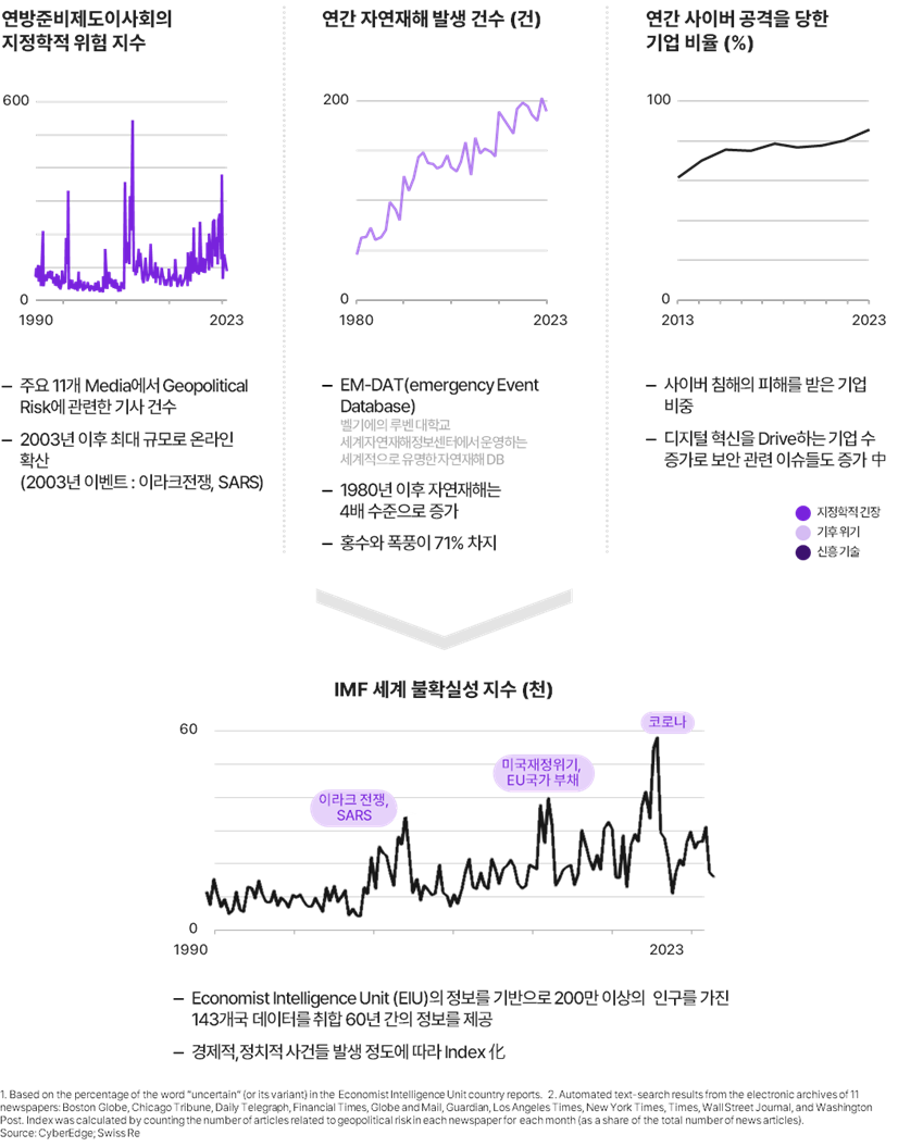 - 이러한 혼란은 과거에도 존재했지만 지속해서 증가하고 있다. World Uncertainty Index(세계 불확실성 지표)를 살펴보면, 팬데믹 동안 사상 최고치를 기록했으며 팬데믹 이후에 상대적으로 낮아졌지만 여전히 상승세를 유지하고 있다. 이제 불확실성은 Normal이 된 것이다.