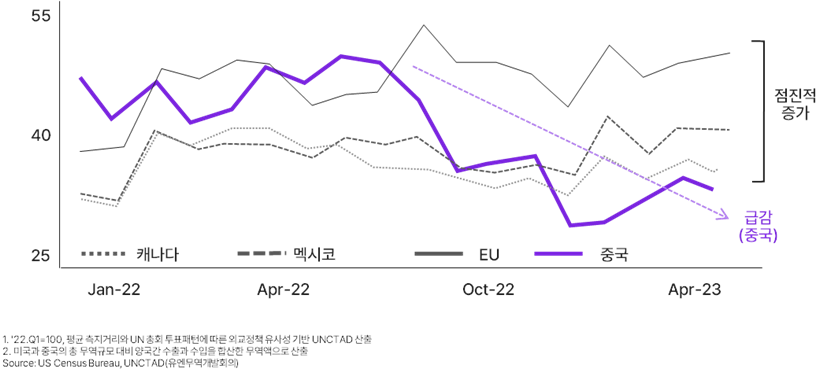 - 미-중 패권 경쟁으로 상호 의존도가 지속해서 하락하고 있다. (`22.Q1 14.3% → Q3 12.3% →`23.Q1 11.9% → Q2 11.6%) 이러한 지정학적 리스크의 확대는 탈세계화와 탈중국을 가속한다.