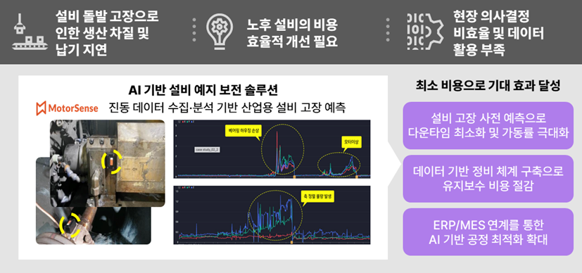 제조업에서 예지보전은 오래된 주제이지만, 대기업과 중견 및 중소기업 간 접근 격차는 큰 편이다. 대기업은 고급 장비와 인프라를 기반으로 분석과 모델 고도화가 비교적 쉽지만, 중견 및 중소기업에게 동일하게 접근하는 것은 현실적으로 쉽지 않다. 그러나, 최근에는 소형 센서를 모터 위에 부착하고, 해당 데이터를 무선으로 수집 및 분석함으로써 가동률을 최적화할 수 있다. 과거에는 상상하기 어려웠던 접근이 기술 발전으로 현실화되면서, 비용 대비 효과가 높은 Fast-track AX 적용이 가능해졌다.