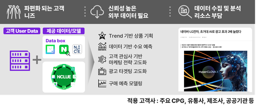 네이버의 사용자 행동 데이터 자체를 직접 제공할 순 없지만, 해당 데이터를 학습한 파운데이션 모델을 SaaS 및 API 형태로 활용할 수 있다. 기업이 보유한 자체 데이터와 결합할 경우, 상품기획, 수요예측, 광고 타켓팅 고도화, 광고 비용 최적화 등에서 비교적 빠르게 성과를 낼 수 있다.
