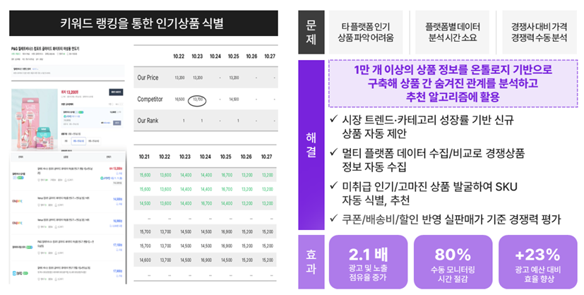 온톨로지 Sourcing Agent는 자사 대비 타 플랫폼의 인기 상품, 고성장 상품, 저가 상품을 자동으로 식별해 소싱 의사결정을 지원하는 AI 시스템이다. 특히 시장 변화에 따라 빠른 판단과 실행이 요구되는 유통 산업에서, 상품 소싱 과정을 자동화함으로써 MD 담당자의 부담을 줄이고 의사결정 속도를 높일 수 있다.