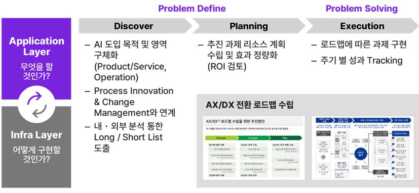 중요한 것은 애플리케이션 레이어에서 무엇을 할지 명확히 정의하고,해당 목표를 가장 효율적으로 달성할 수 있는 도구로서 기술을 선택해야 한다는 점이다. 최근에 AX 과제를 경험한 고객사를 많이 만난다. 그러나 몇 회사는 각 부서가 숙제처럼 AX를 수행하거나, 파편적으로 진행하거나, ‘사람 뽑아서 추진 시켰는데, 무엇이 좋아졌는지‘에 대한 요구를 받는다. 이에 모든 AX 활동을 기업의 핵심 KPI(비용 절감, 매출 증대 등)와 직접적으로 연결시킬 필요가 있다.