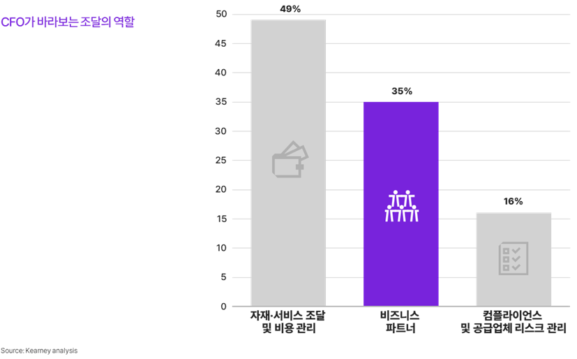조달(Procurement)이 지닌 잠재력은, 오늘날 CFO 아젠다에서 가장 과소평가된 영역일지도 모른다. 대부분의 제조기업에서 외부 조달 지출은 매출의 약 65%를 차지하며, 서비스 산업에서도 그 비중은 약 30%에 이른다. 그럼에도 불구하고 Kearney의 최신 연구에 따르면 조달을 전략적 파트너로 인식하는 CFO는 3명 중 1명에 불과하다. 이는 불과 몇 년 전과 비교해 현저히 낮아진 수치다. 이러한 인식의 괴리는 결코 가볍지 않다. 조달의 역할이 단순한 비용 통제 기능에 머무를 경우, 기업은 혁신 역량과 공급 측면의 경쟁우위를 충분히 활용하지 못한 채 방치하게 된다.