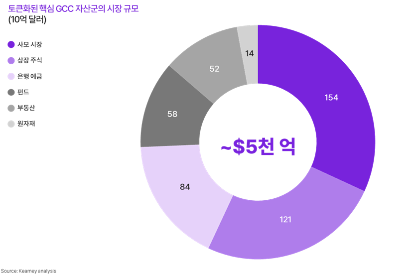 GCC 지역에서 토큰화 기회가 가장 큰 분야는 사모 시장이다. 전통적으로 사모 시장은 거래가 어렵고 정보가 불투명한 측면이 많아 투자자들 사이에서 더 접근하기 쉽고 투명한 참여 방식에 대한 요구가 높았는데, 토큰화는 이 문제를 해결하기에 적합하다. 또한 이 자산군은 2024년 4조 5,000억 달러에서 2030년 6조 달러 이상으로 성장할 것으로 예상되며, 국부펀드(SWF), 패밀리 오피스, 기관 투자자를 포함한 지역 내 투자자들이 가장 활발하게 참여하고 있다.